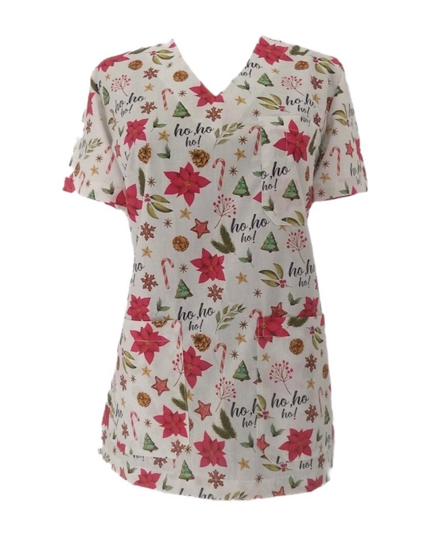 Η χριστουγεννιάτικη παιδιατρική μπλούζα με λευκό φόντο προσθέτει μια γιορτινή πινελιά στο επαγγελματικό σας περιβάλλον, ενισχύοντας την καλή διάθεση και τη θετική επικοινωνία με τους μικρούς ασθενείς.