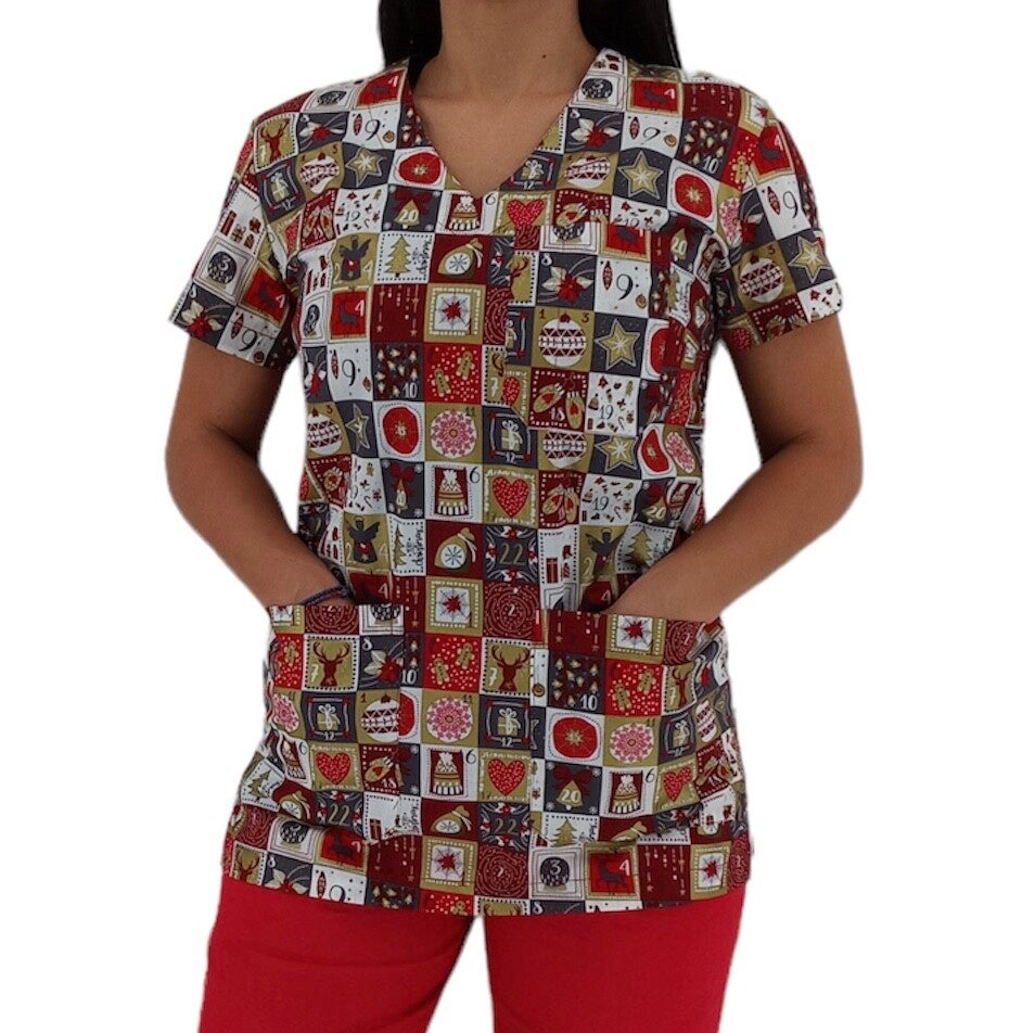 Η χριστουγεννιάτικη παιδιατρική μπλούζα με χρυσές, κόκκινες και λευκές λεπτομέρειες προσθέτει μια ζεστή και γιορτινή πινελιά στο επαγγελματικό σας περιβάλλον, ενισχύοντας τη θετική επικοινωνία με τους μικρούς ασθενείς.