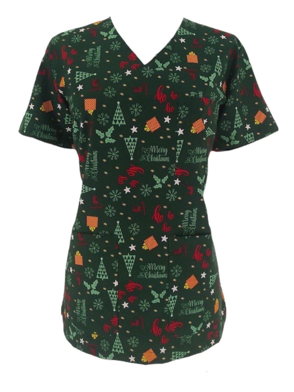 Ιδανική για παιδίατρους, νοσηλευτές/νοσηλεύτριες, αλλά και για κτηνιάτρους, αυτή η χριστουγεννιάτικη μπλούζα με πράσινο φόντο και έλατα με δώρα δημιουργεί χαρούμενη και φιλική ατμόσφαιρα για παιδιά και πελάτες.