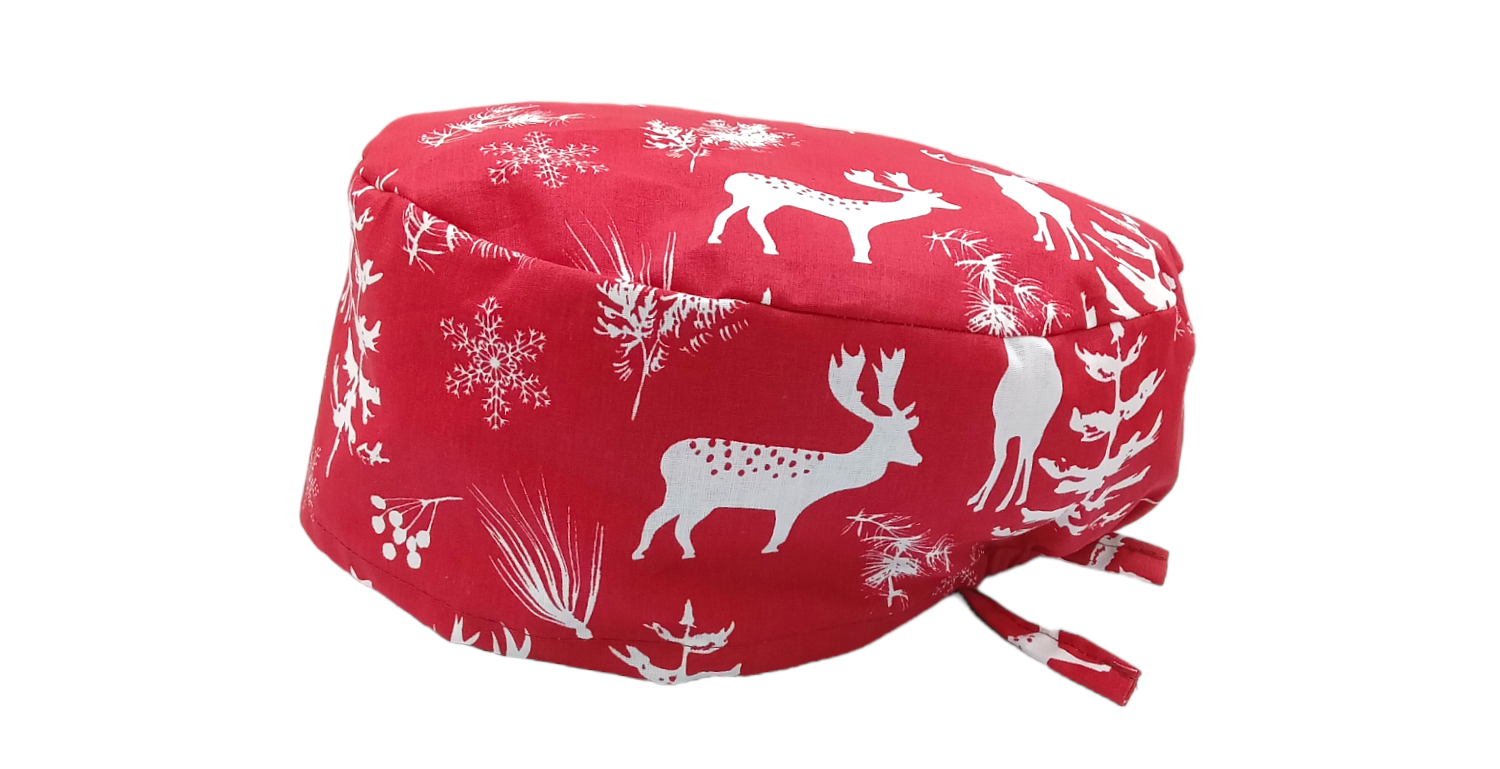 Γιορτινό και κομψό, αυτό το γυναικείο χειρουργικό σκουφάκι σε κόκκινο φόντο είναι διακοσμημένο με λευκούς τάρανδους, προσδίδοντας μια διακριτική αλλά χαρούμενη χριστουγεννιάτικη νότα.
